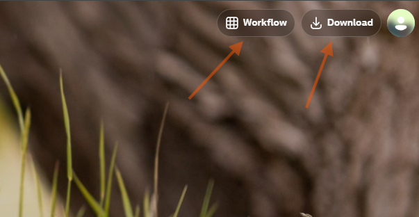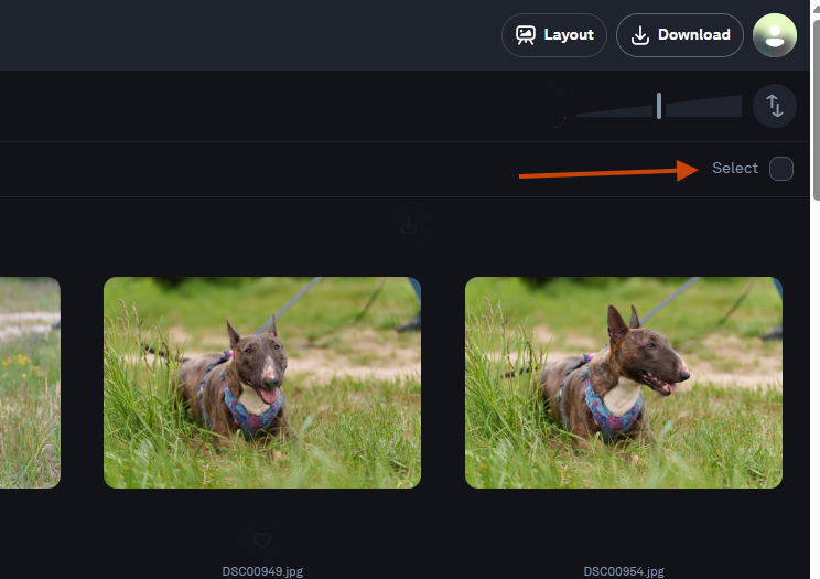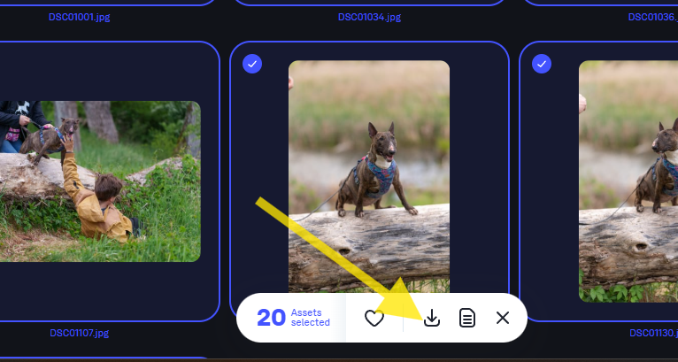 By pobrać wszystkie zdjęcia tylko jednego psa, musimy wejść w tryb Workflow. W tym celu klikamy przycisk „Workflow” (na urządzeniach mobilnych to będzie symbol siatki). Na zrzucie ekranu ten przycisk jest oznaczony lewą strzałką.
